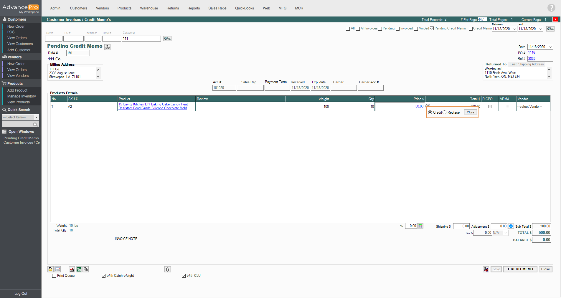 This new AdvancePro feature will have the option to change or update the RMA resolution on a pending Credit Memo.