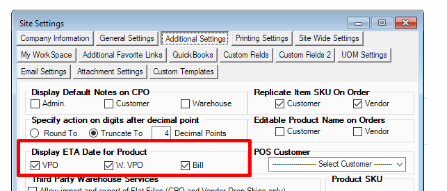 To display the ETA Date of each line item on a Vendor Order, go to Admin > Site Settings > Additional Settings.